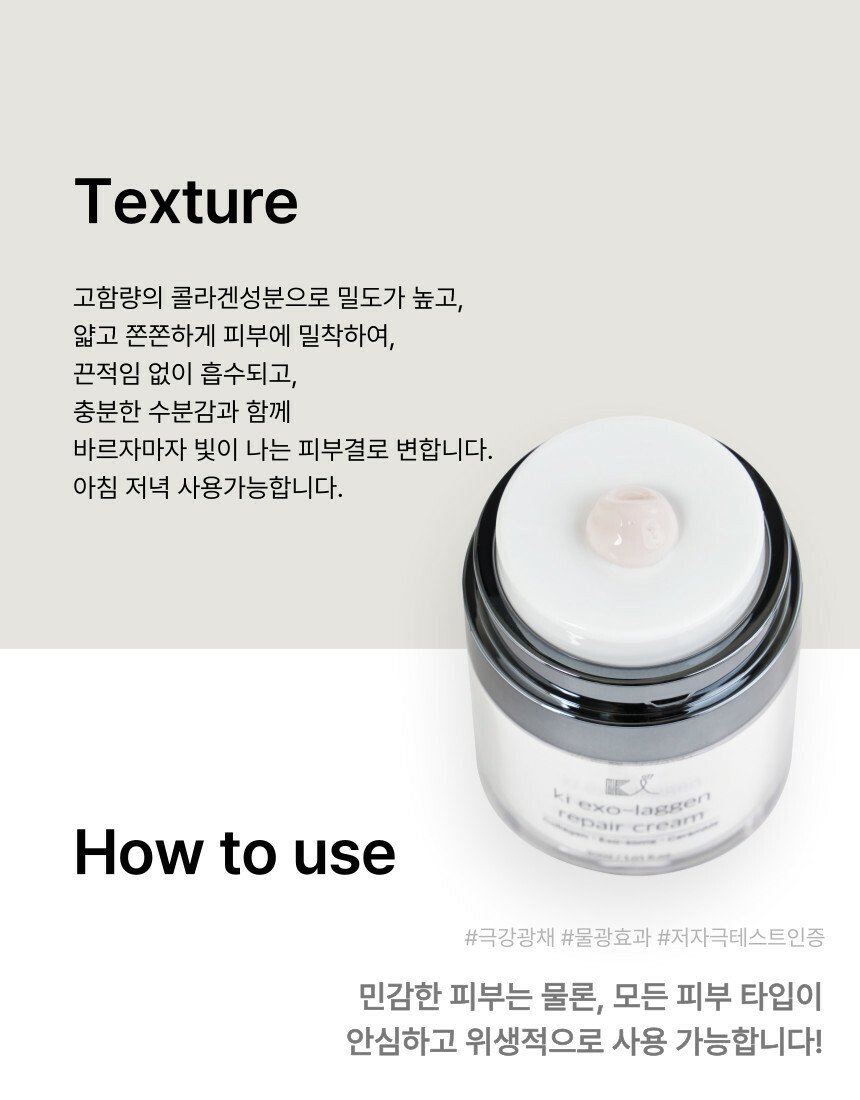 開發分解為 380 道爾頓的超低分子膠原蛋白,小 於毛孔的十億分之一,利用K.I自己的技術,將30,000道爾頓的膠原蛋白水解成380道爾頓的超低分子,這個尺寸可以被皮膚吸收,從而最大限度地提高皮膚吸收