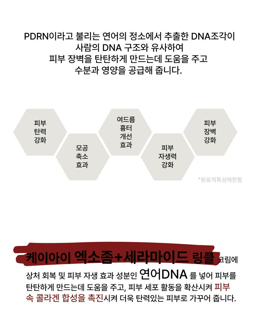 從鮭魚提取的DNA稱為PDRN,與人類DNA結構 相似,有助於強化皮膚屏障,同時提供水分和營養。
