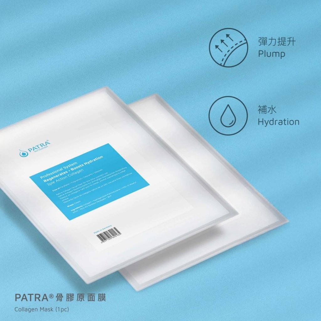 使用方法:剪裁面膜至合適面形,配合骨膠原面膜精華液一同使用,敷 20 分鐘後取走面膜,輕柔按摩剩餘精華液至被完全吸收