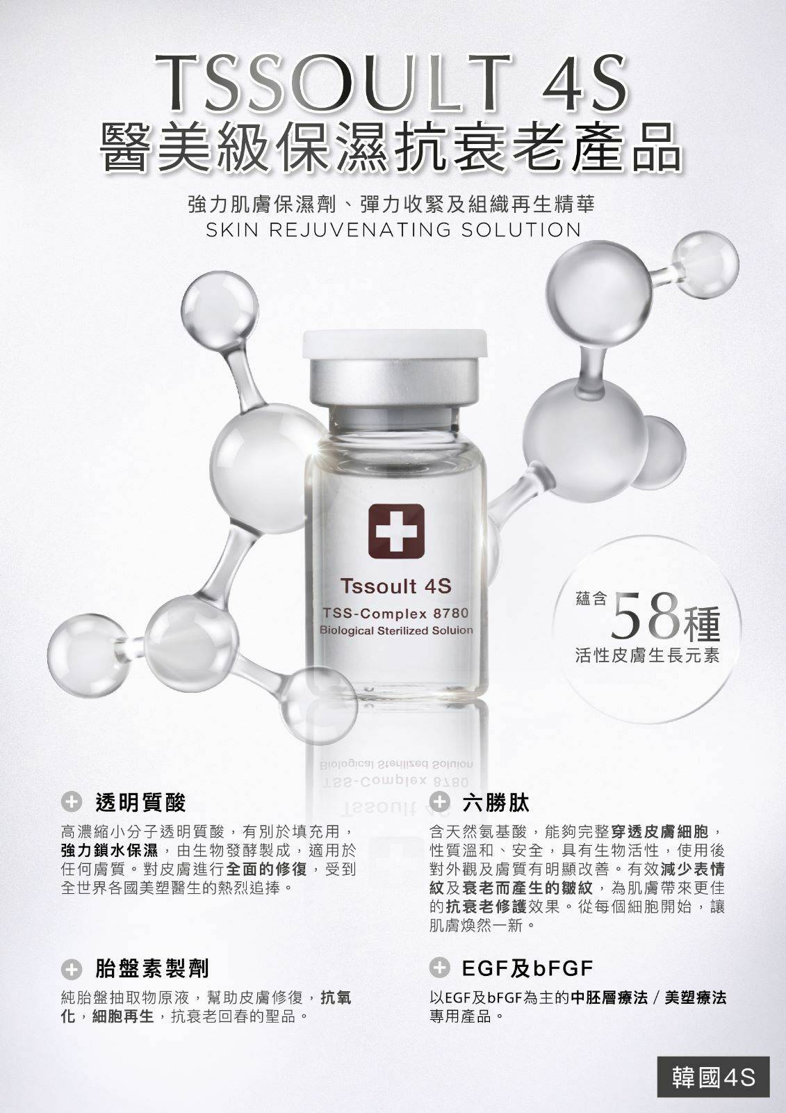 Tssoult 4S精華由韓國製造,蘊含58種活性皮膚生長元素(內含1%透明質酸、胎盤素製劑及六勝肽):高濃縮小分子透明質酸由生物發酵製成、胎盤素製劑為純胎盤抽取物原液,六勝肽蘊含天然氨基酸,為醫美級保濕抗衰老產品,並廣泛應用於世界各地。