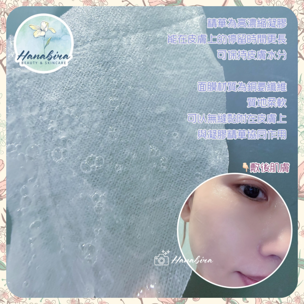 面膜材質係銅氨纖維,質地柔軟,可以無縫黏附在皮膚上,與凝膠精華協同作用
