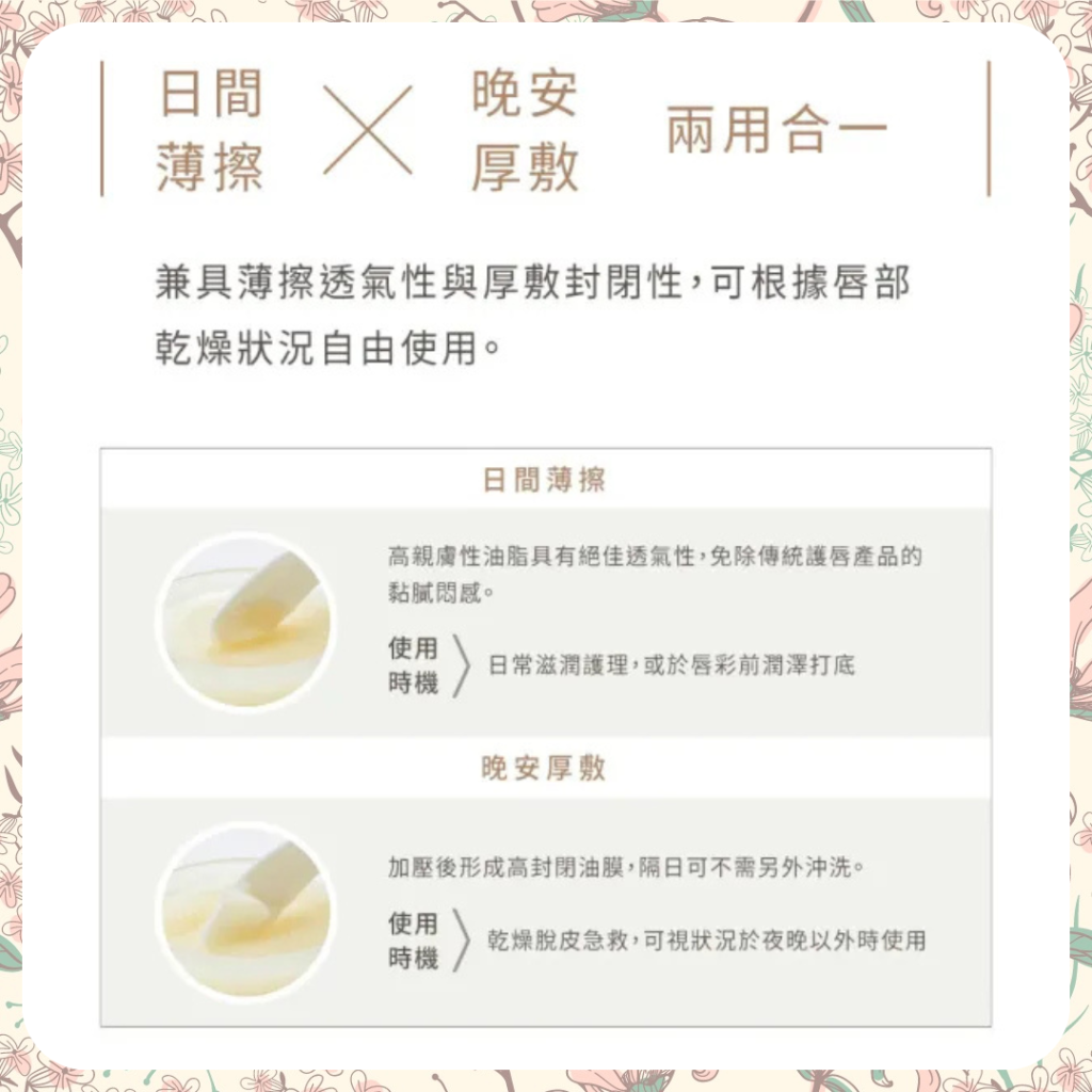 可隨唇部乾燥程度,自由選擇「日間薄擦」或「晚安厚敷」兩種用法