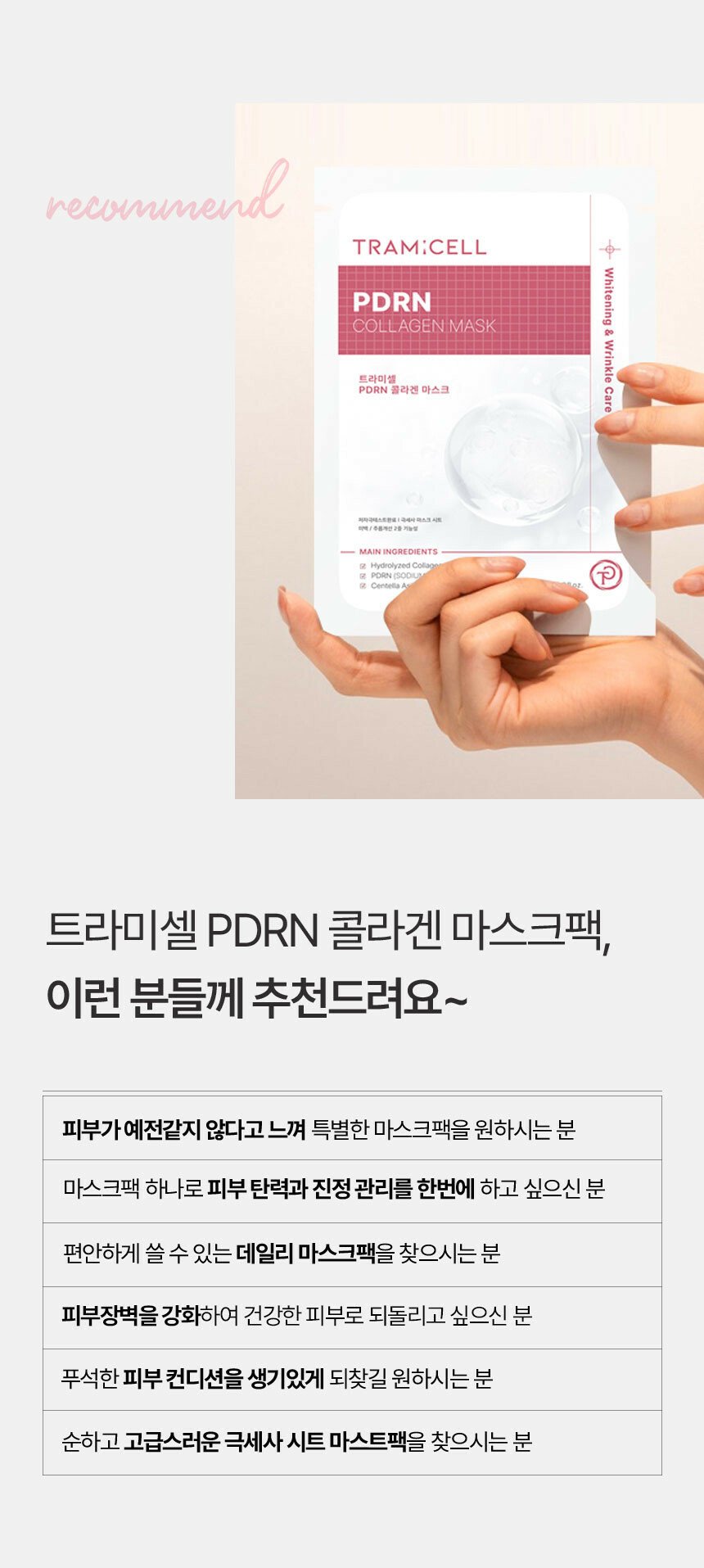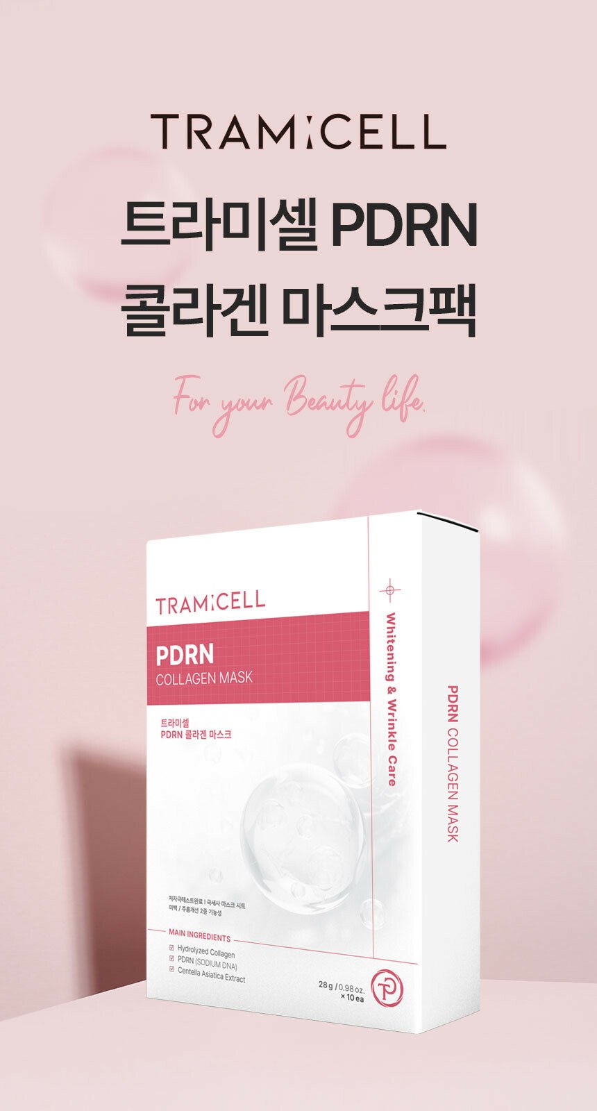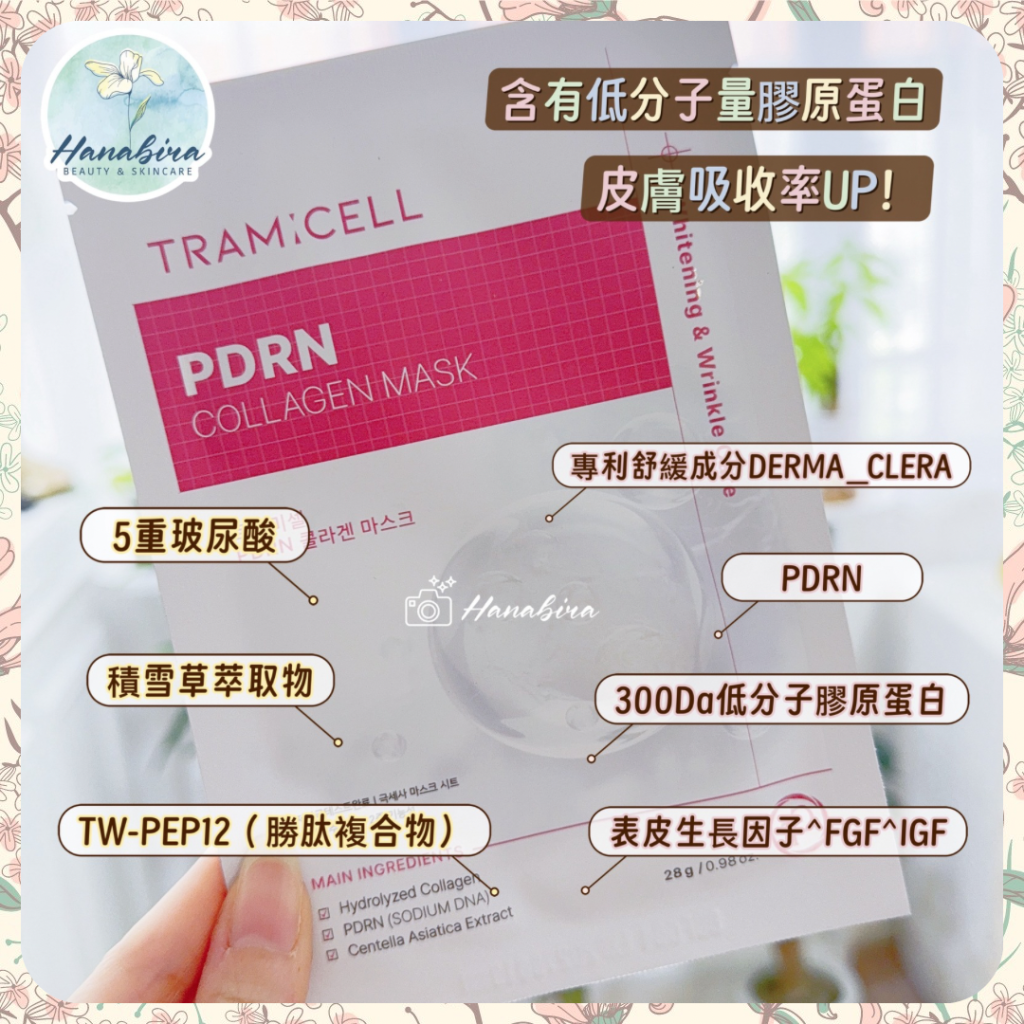 PDRN膠原蛋白面膜係以膠原蛋白為主,配合多種天然萃取物、14種勝肽、 PDRN、專利舒緩成分等優質成分,提供有效營養,是美白/改善皺紋的雙功能面膜。
