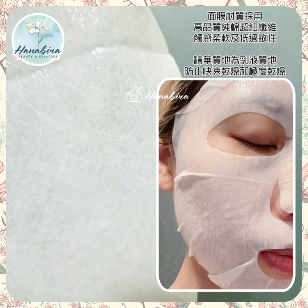 面膜材質採用高品質純棉超細纖維,觸感柔軟及低過敏性,使用比頭髮更細的纖維製成的柔軟纖維,最大限度地減少皮膚刺激,能均勻輸送精華活性成分和水分