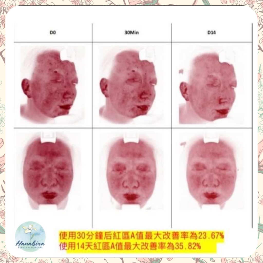 源頭舒緩各類痘痘、閉口、泛紅、敏感、乾癢等肌膚問題,改善敏感粗糙讓肌膚更順滑。使用30分鐘紅區a值最大改善率為23.67%