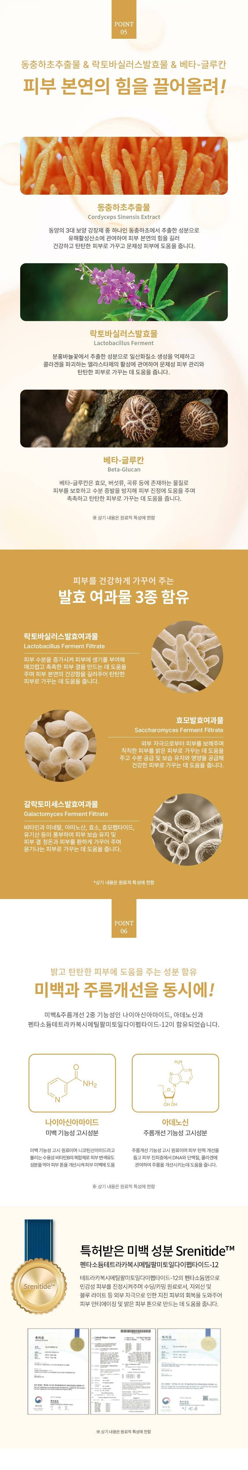 ●包含三種類型發酵濾液(乳酸桿菌發酵濾液 、酵母菌發酵濾液 、半乳糖酵母菌發酵濾液)——增加皮膚水分,恢復肌膚活力,保護皮膚免受外界刺激,提亮肌膚,讓肌膚有光澤,幫助創造光滑和滋潤肌膚紋理