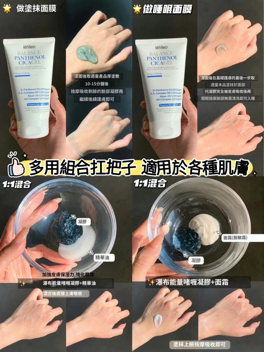 0色素添加8重植物提取物,清透藍色啫喱質地,抹開化水瞬間吸收,快充水分,冰膚瑩潤,舒緩肌膚各種不適,厚敷當塗抹面膜,薄塗當睡眠面膜,不黏膚不霑衣,能肉眼可見冰藍凝膠被肌膚吸收