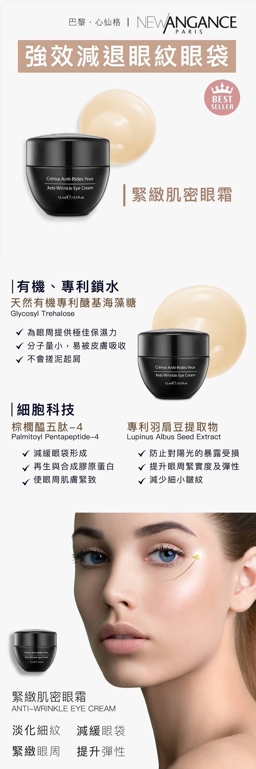 New Angance 緊緻肌密眼霜為你解決眼周的多重困擾,從根本改善眼袋浮腫、暗沉黑眼圈與細紋問題。質地清爽不厚重,深入滋養同時溫和不刺激,不會引起油脂粒或毛孔堵塞。添加保濕與舒緩成分,有效為脆弱眼周注入水分與彈力,讓肌膚恢復柔嫩平滑。不論是剛開始出現初老徵兆,或是熟齡肌膚渴望更多修護,它都能提供溫柔又確實的呵護,陪你從現在開始,慢慢找回明亮有神的雙眼。