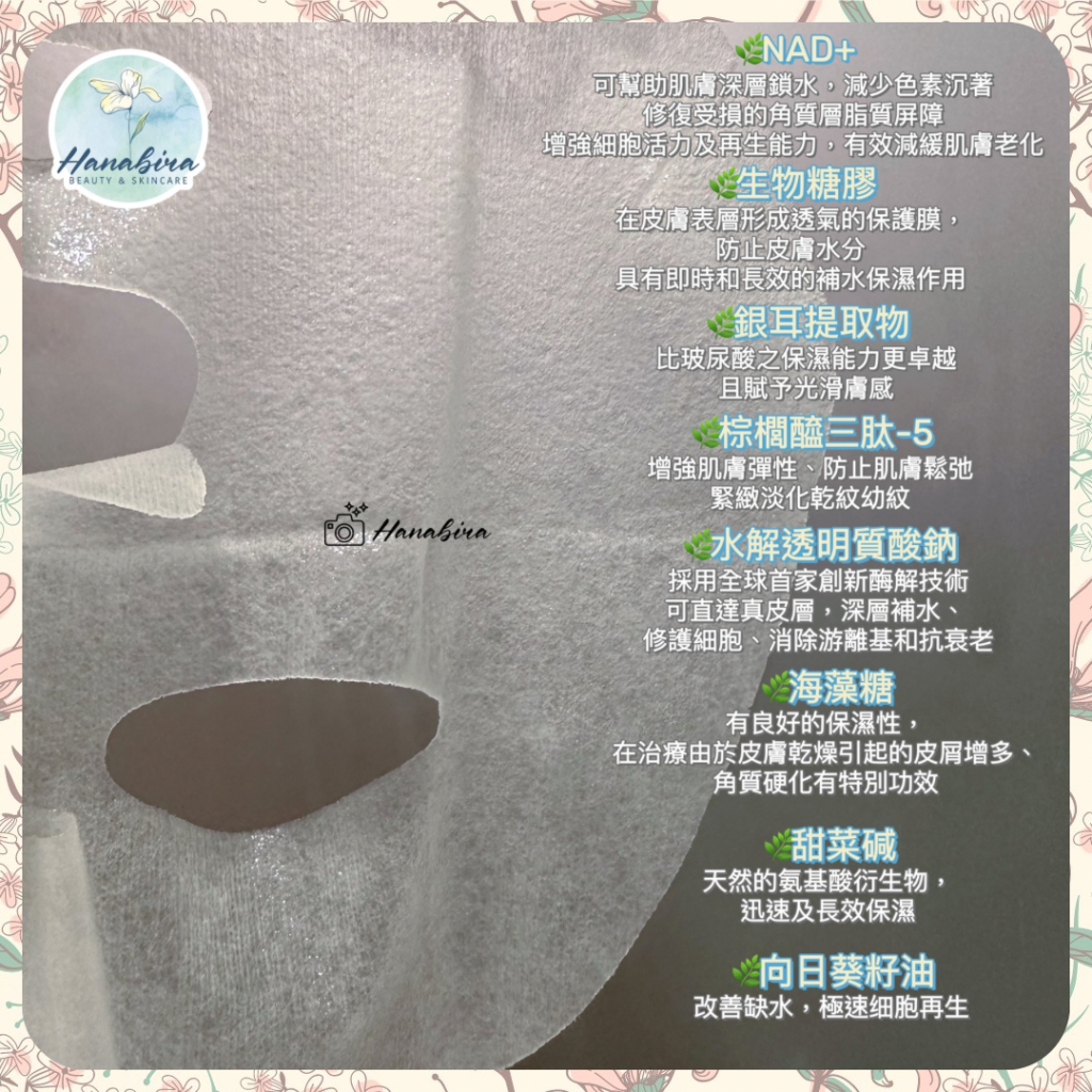 NAD+ 逆齡煥采面膜同精華一樣加入最強的 NAD+ 醫學級抗老成份,由源頭激活細胞能量,加速細胞更生;具卓越抗氧功效的白藜蘆醇成份高效修護肌膚屏障,擊退粗糙及暗沉,勻亮膚色,同時為肌膚傾注保濕抗皺功效,由表層至真皮層,全面修復滋養
