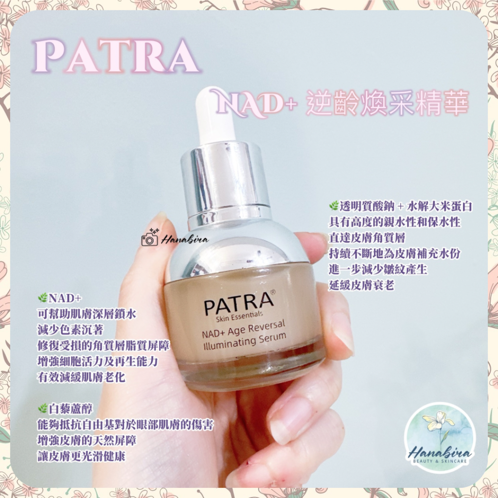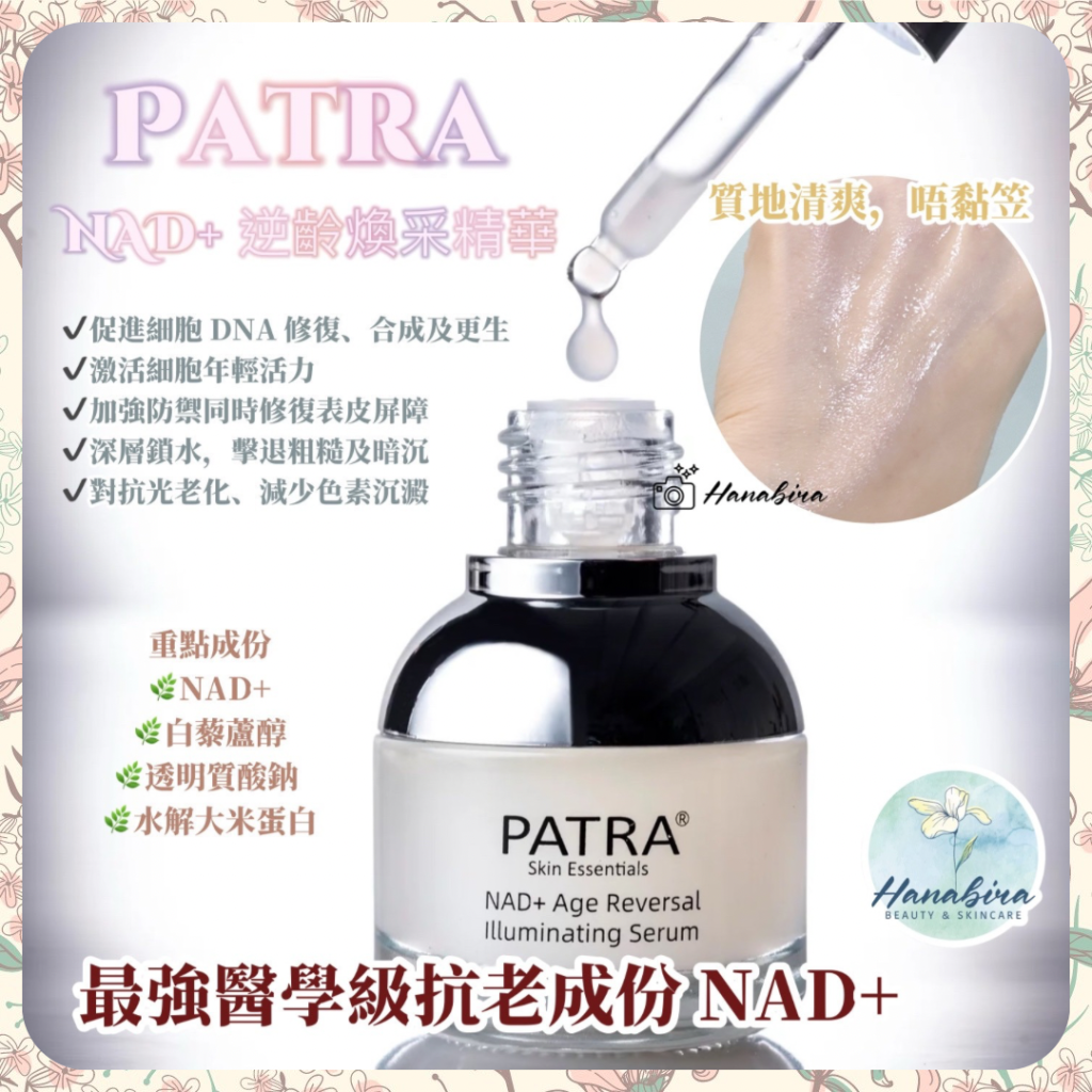 NAD+ 逆齡煥采精華,加入最強的 NAD+ 醫學級抗老成份,由源頭激活細胞能量,加速細胞更生;具卓越抗氧功效的白藜蘆醇成份高效修護肌膚屏障,擊退粗糙及暗沉,勻亮膚色。加上 Patra 靈魂成份燕窩提取液瞬間滲透肌底,由肌源抑黑提亮,煥活新生淨透嫩肌!