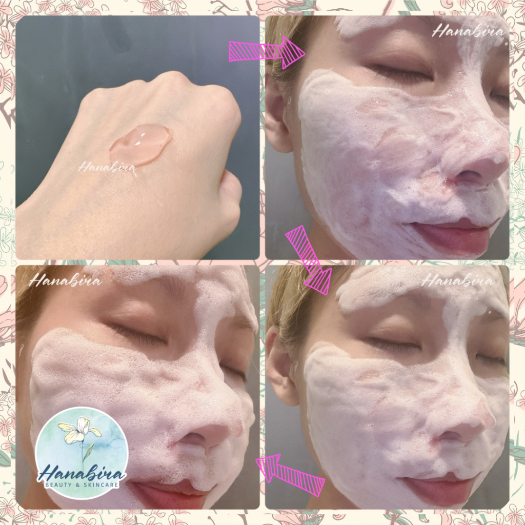 粉紅色啫喱狀質地,搽上面之後會慢慢起啲好綿綿細細嘅泡泡,佢同注氧面膜唔同,佢唔會有刺痛吉嘅感覺,但會feel到啲泡泡越嚟越多同好綿綿嘅感覺😌 所以敏感/暗瘡皮膚都適合用架🫶🏻