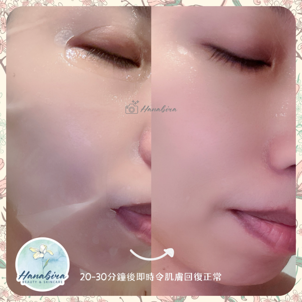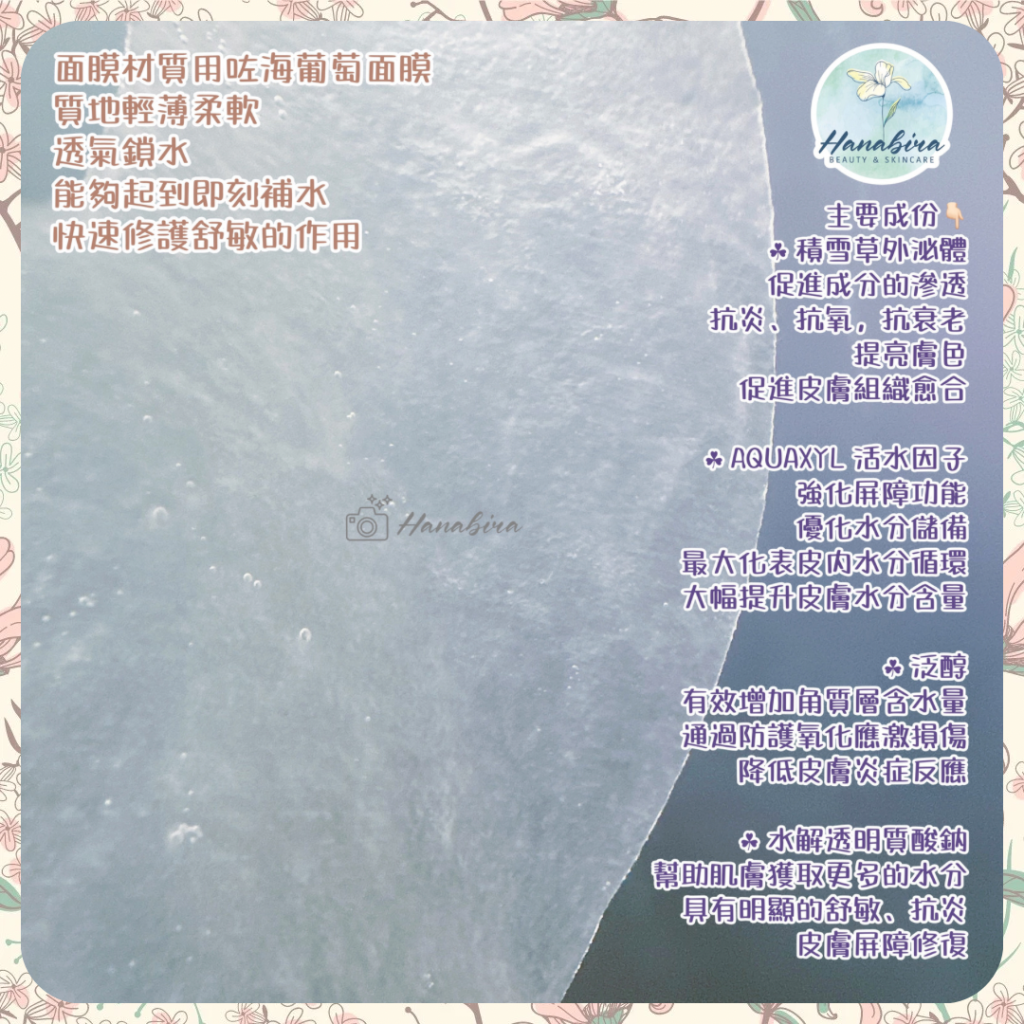 面膜用咗非常特別嘅海葡萄面膜,面膜質地輕薄柔軟,透氣鎖水,能夠起到即刻補水、快速修護舒敏的作用